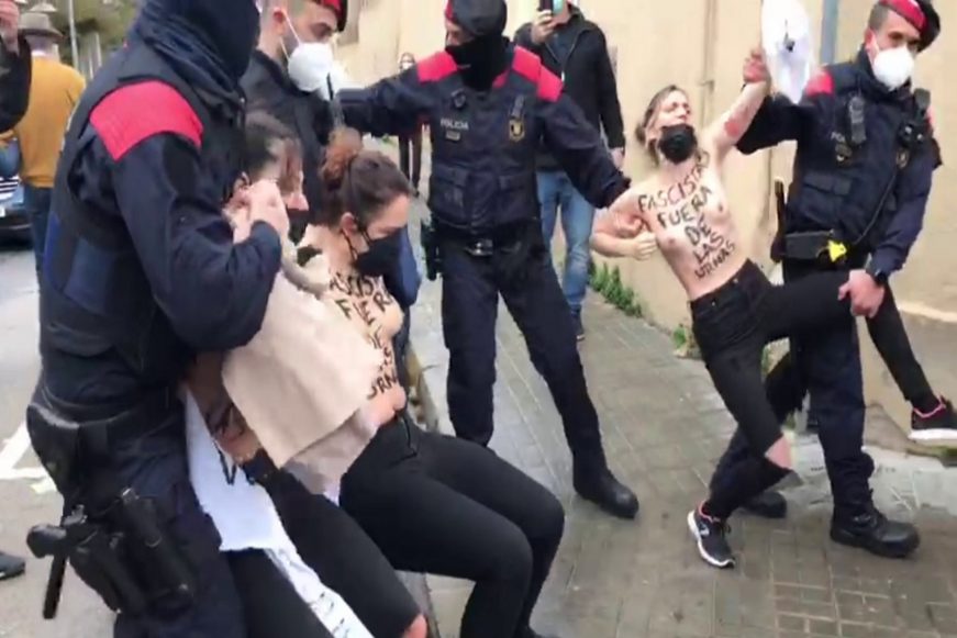 VÍDEO. Barcelona, 14.02.202.Los atacantes han lanzado papeles verdes con el mensaje: «Fascistas fuera de las urnas» del 14F. «Femen contra el fascismo político institucional», en referencia a la banda feminista de extrema izquierda.