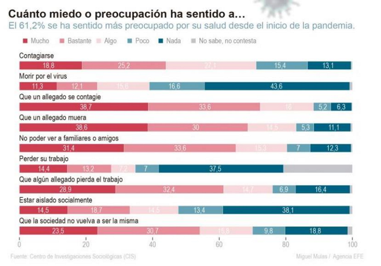 Con la pandemia, los españoles temen más por su salud, y ese miedo se constata cuando admiten que se sienten cansados o con pocas energías (51,9 por ciento), con problemas de sueño (41,9 por ciento) o con dolores de cabeza (38,7) y otros problemas como taquicardia, mareos o desmayos.