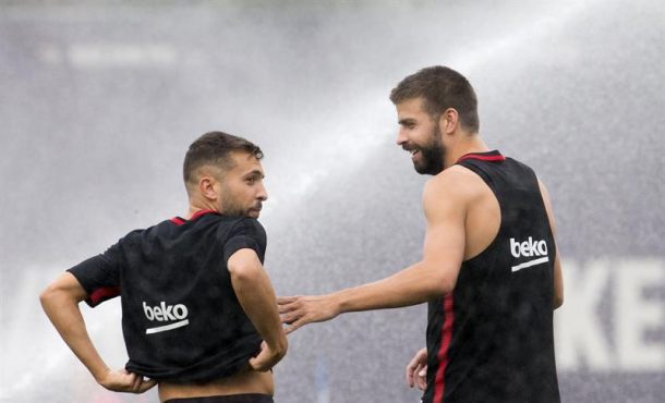 Agencias – Vuelta de la Supercopa de España. El partido será hoy, miércoles 16 de agosto de 2017, a las 23:00 de la noche. FC Barsa perdió en la ida en el Campo Nuevo con un marcador de 1-3. Por lo tanto, deben marcar al menos tres goles hoy para hacerse con el título. Madrid (España), miércoles 16 de agosto de 2017. Fotografía: Los defensas del FC Barcelona Jordi Alba (i) y Gerard Piqué (d), conversan durante la sesión de entrenamiento del FC Barcelona ayer en la Ciudad deportiva Joan Gamper. Efe.