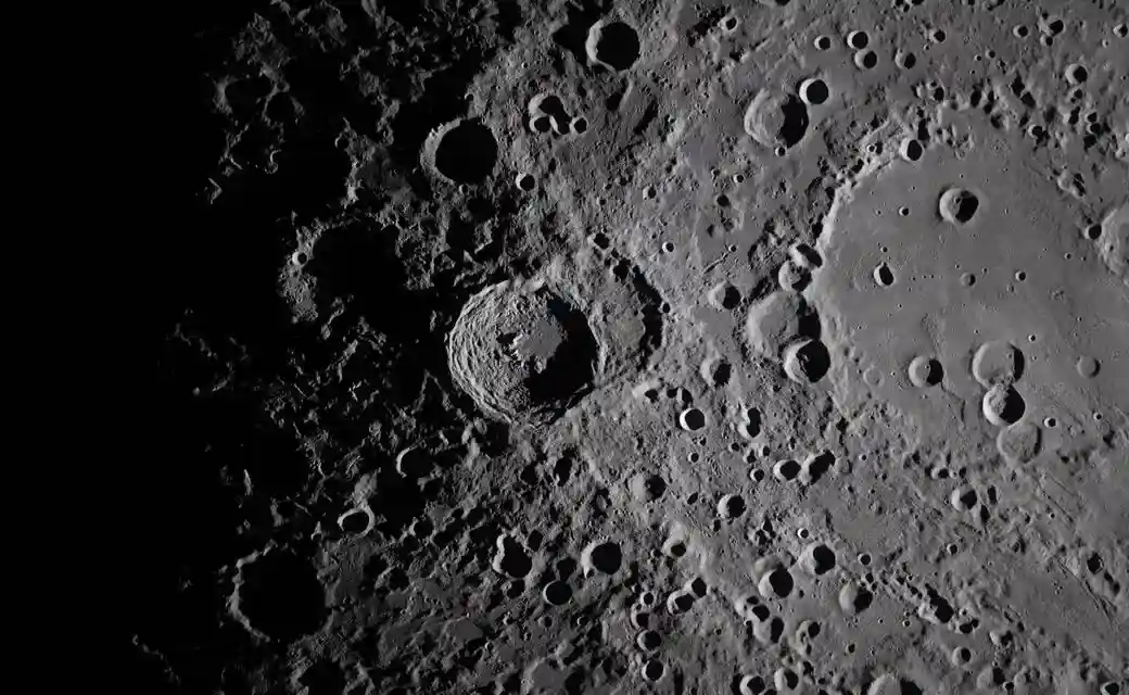 Vavilov y otros cráteres, junto con sus eyecciones, se ven acentuados por largas sombras en el terminador, el límite entre el día y la noche lunares.