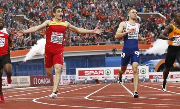 Un día después del rutilante éxito de Ruth Beitia, con su tercer título en altura, Hortelano se enganchó a la bandera española que le proporcionó la propia Beitia para dar la vuelta de honor sin saber todavía que había ganado la final tras la descalificación del holandés Curandy Martina por pisar fuera de su carril en la curva.