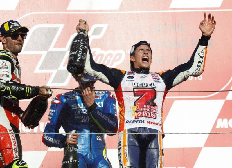 El español Marc Márquez (Repsol Honda RC 213 V) fue capaz de desesperar a su rival por el título, el italiano Andrea Dovizioso (Ducati Desmosedici GP18), para que éste cometiese un error que le permitió proclamarse campeón del mundo por quinta vez en el Gran Premio de Japón de MotoGP, que se disputó en el circuito Twin Ring Motegi.