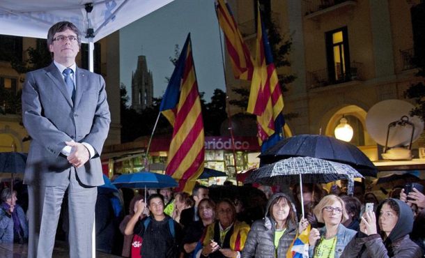 En un acto del PDeCAT en favor del 1-O en la plaza de la Independencia de Gerona, celebrado bajo una intensa lluvia, Puigdemont ha apostado por construir «un país mejor que huya de estas prácticas antidemocráticas propias de país totalitario, en las que el Estado español está incurriendo estos últimos días al aplicar sin debate parlamentario» el artículo 155, que abre la puerta a la intervención de la autonomía catalana.