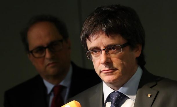 Lasvocesdelpueblo y Agencias – Una burla a la legalidad española y alemana. El huido golpista Carles Puigdemont, tras su inhabilitación por el juez Pablo Llarena, se ha quedado sin recursos económicos. Asimismo, el fascismo de la genestapo en Cataluña dice que consultará al Gobierno del presidente Pedro Sánchez sobre el envío de un grupo de los Mozos de Escuadra en servicio a Berlín (Alemania), donde el delincuente Puigdemont ya está pendiente de su extradición a España -según ha decidido hoy la Justicia Alemana sin concretar fecha o período de la entrega del neonazi-, para garantizar la «seguridad» de Puigdemont en Alemania, alega el fascismo. Madrid (España), jueves 12 de julio de 2018. Fotografía: BERLÍN (ALEMANIA), 15.05.2018. El huido golpista expresidente regional catalán Carles Puigdemont da una rueda de prensa en presencia de su sucesor, el recién elegido neonazi presidente de la Generalidad de Cataluña, Quim Torra (i), durante una rueda de prensa convocada en el Hotel Sana en Berlín (Alemania) hoy. Efe