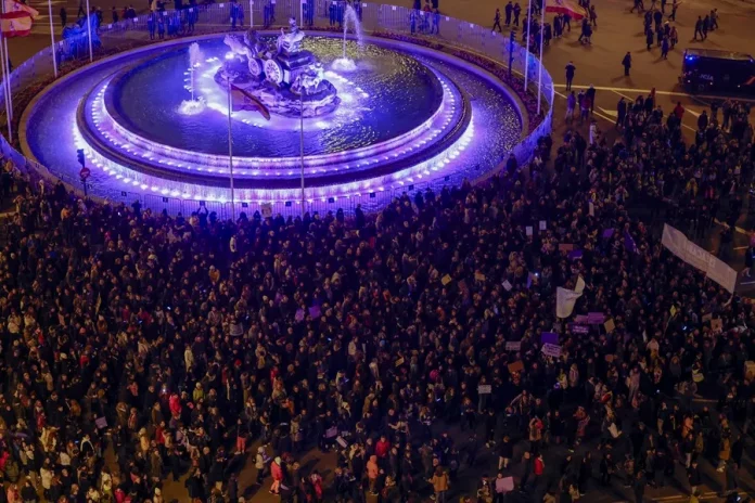 El feminismo tiñe de morado España el 8M |En la capital del Reino de España, Madrid se han vuelto a convocar dos manifestaciones, la histórica organizada por la Comisión del 8M, que ha reunido a 30.000 personas, según la Delegación del Gobierno, (500.000 según las organizadoras) y otra por el Movimiento Feminista de Madrid (MFM) que rechaza la Ley trans, «el borrado de las mujeres» y pide la abolición de la prostitución y en la que han participado unas 4.000 personas, según delegación y más de 30.000, según la organización, un feminismo que ha teñido también de morado Madrid.
