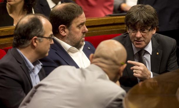 Lasvocesdelpueblo y Agencias – El portavoz del Gobierno catalán, Jordi Turull Negre, denuncia la «persecución» a los separatistas en Cataluña y contrapone las «complicidades de tribunales, policiales y mediáticas» del presidente de Gobierno central, Mariano Rajoy, a la voluntad del separatismo (ERC, PDECAT y CUP) que es «votar en un referéndum» separatista sí o sí el próximo 1 de octubre en Cataluña. Barcelona (España), domingo 30 de julio de 2017. Fotografía: El presidente de la Generalidad, Carles Puigdemont, junto al vicepresidente Oriol Junqueras (2i), el consejero de la Presidencia Jordi Turull (i) y el consejero de Exteriores, Raül Romeva, durante el pleno del parlamento de Cataluña. Efe.