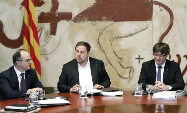 Lasvocesdelpueblo y Agencias – El Gobierno de la Generalidad de Cataluña ha registrado en los últimos tres meses una veintena de cambios, en forma de relevos, ceses o dimisiones, entre el gobierno y altos cargos de la administración, en su proceso hacia el referéndum separatista que pretende celebrar el próximo 1 de octubre de 2017 en Cataluña. Barcelona (España), jueves 20 de julio de 2017. Fotografía: El presidente de la Generalidad de Cataluña, Carles Puigdemont (d) junto al vicepresidente del Gobierno y consejero de Economía, Oriol Junqueras (c) y el consejero de la Presidencia y portavoz del Gobierno catalán, Jordi Turull (i) durante la reunión semanal del Gobierno regional catalán. Efe.