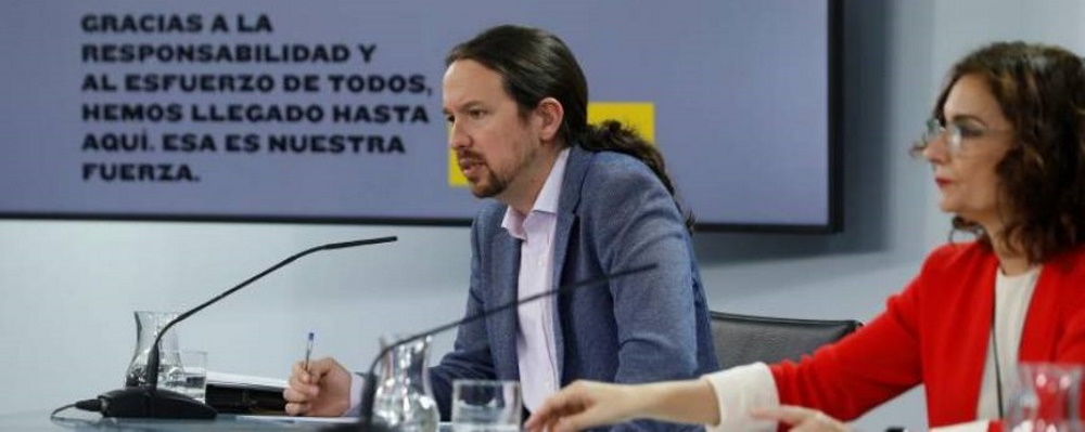 FOTOGRAFÍA. MADRID (ESPAÑA), 08.06.2020. La portavoz del Gobierno comunista, María Jesús Montero, y el vicepresidente tercero del Ejecutivo, Pablo Iglesias, durante la rueda de prensa posterior a la reunión del Consejo de Ministros celebrada este martes en el complejo de La Moncloa. Efe