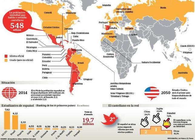 EFE – El director del Instituto Cervantes, Víctor García de la Concha, y el presidente de RTVE, José Antonio Sánchez, han firmado hoy un convenio de colaboración para promover y difundir tanto el idioma como la cultura española. Según ha informado RTVE, este lunes 7 de septiembre 2015, las dos instituciones han acordado intercambiar contenidos propios y colaborar en la producción de otros de carácter cultural para su emisión. <Fotografía: Mapa del accenso de la lengua española en los países hispanohablantes del mundo actualmente. Foto archivo>.