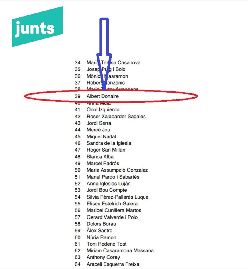 Redacción – Albert Donaire Malagelada, el agente de la Policía autonómica de la Generalidad de Cataluña Mozos de Escuadra y líder de los grupos de mozos separatistas, —integrantes de dos entidades policiales secesionistas: «Mozos por la Independencia de Cataluña» y «Mozos por la Democracia» (Mozos por el referéndum de independencia)— es el número 39 de la lista electoral (PDF) del partido del golpista huido de la Justicia Carles Puigdemont Casamajò, Juntos Por Cataluña (JxCat), por Barcelona al Parlamento de Cataluña el próximo domingo, 14 de febrero de 2021 (14F). Barcelona (España), miércoles 6 de enero de 2021.