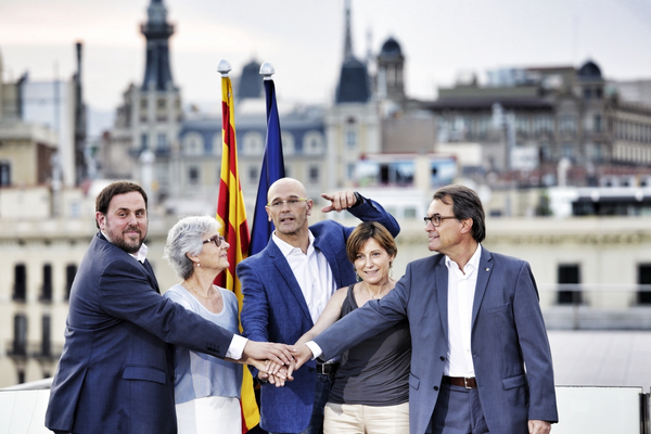 Agencias – El Parlamento autonómico de Cataluña con su mayoría sediciosa formada por los 62 diputados autonómicos de Juntos Por El Sí (JxSí) y 10 extremistas de la batasuna catalana de Candidatura de Unidad Popular-Proceso Constituyente (CUP-CC) aprobará mañana, lunes 9 de noviembre 2015 -coincidiendo con el golpe separatista del pasado 9N 2014 cuyo caso está aun sin zanjar en el Tribunal Superior de Justicia de Cataluña (TSJC)-, la propuesta de resolución pactada por (JxS) y la (CUP-CC) que solemniza el inicio del proceso hacia la separación de Cataluña del resto de la patria y menosprecia la decisión de la mayoría de los catalanes -52% de los catalanes en contra- en las urnas del pasado 27 de septiembre 2015 y vulnera también el propio Estatuto autonómico de Cataluña dado que las dos formaciones golpistas no tiene ni siquiera el apoyo correspondiente a los tres tercios de la cámara catalana para cambiar solo una coma en el Estatuto catalán. Barcelona, 8 noviembre 2015. <Fotografía: De izquierda a derecha, los golpista Oriol Junqueras Vies , Muriel Casals Couturier, Raül Romeva, Carme Forcadell Lluis y Artur Mas Gavarró. Foto Pere Virgili>.