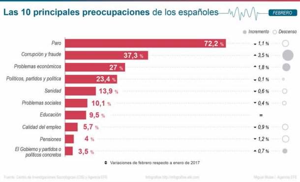 El orden de preocupaciones que enumera el CIS en su estudio de febrero coincide con el del barómetro del mes anterior, pero sólo suben la corrupción, los problemas económicos y la sanidad.