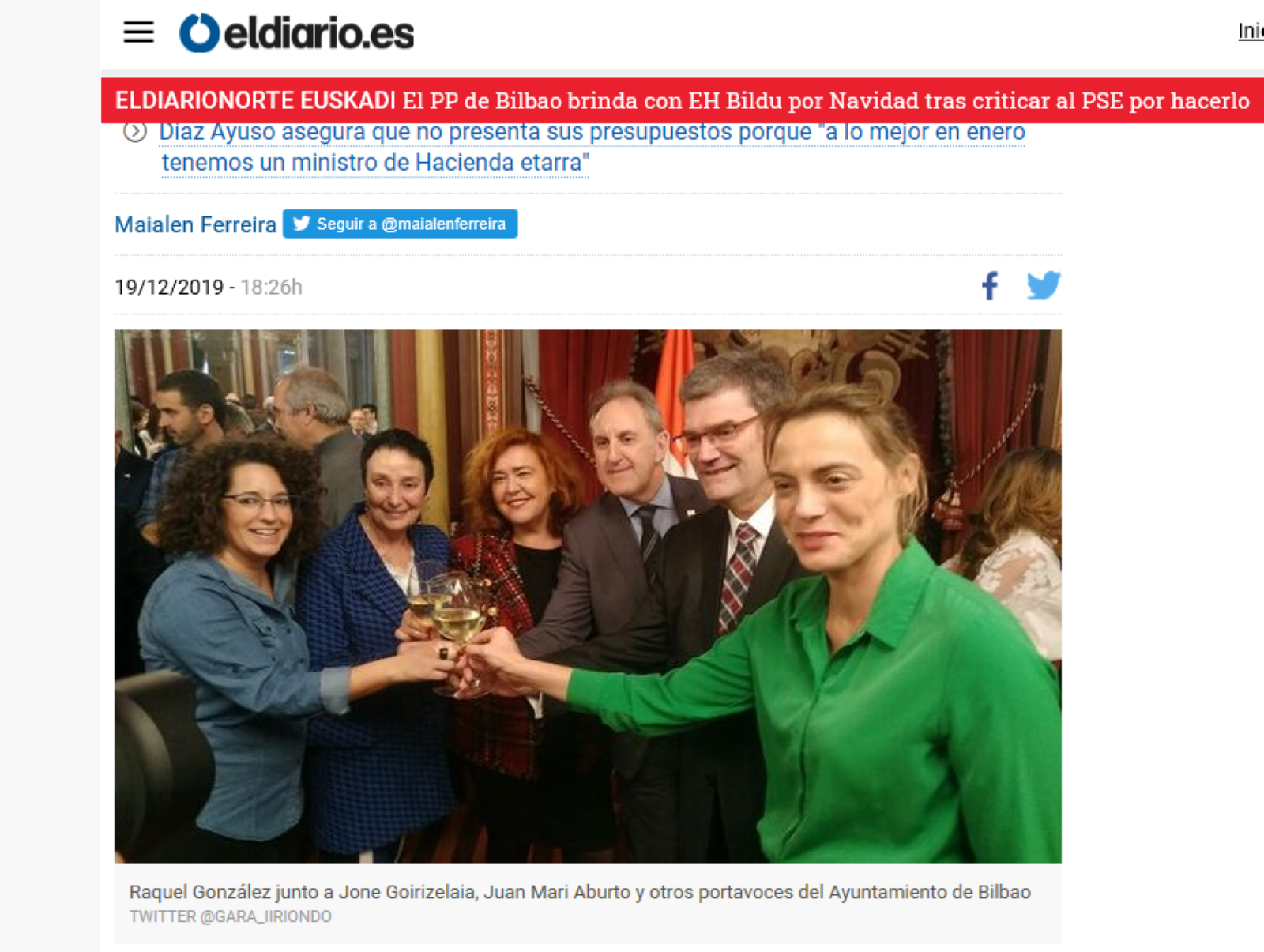 Tal como recoge el digital «Eldiario.es», en su edición del jueves, 19 de mayo de 2019 —el mismo día que ha caído sobre España y su pueblo las consecuencias de las cesiones y colaboraciones del PP y PSOE con el separatismo, desde un Tribunal europeo: Tribunal de Justicia de la Unión Europea (TJUE) apoyando al Procés y atacando gravemente la soberanía nacional de España, considerando diputados electos de la Eurocámara a los huidos golpistas del Procés, Carles Puigdemont Casamajò (JxCat) y Toni Comins (ERC) y considerando también eurodiputado al preso golpista Oriol Junqueras Vies (ERC) desde la noche electoral de las lecciones europeas del mayo de 2019 hasta el pasado lunes, 14 de octubre de 2019, coincidiendo con la condena del Juicio Procés— Ajenos al revuelo que la presidenta de la Comunidad de Madrid, Isabel Díaz Ayuso, ha suscitado con sus declaraciones acerca de que «a lo mejor a partir de enero tenemos un ministro de Hacienda etarra», en Bilbao, la presidenta del PP de Vizcaya y portavoz municipal, Raquel González, se ha reunido con varios representantes políticos, entre ellos la portavoz de Ayuntamiento de Bilbao de EH Bildu e histórica de la izquierda abertzale, Jone Goirizelaia, en el tradicional brindis navideño.