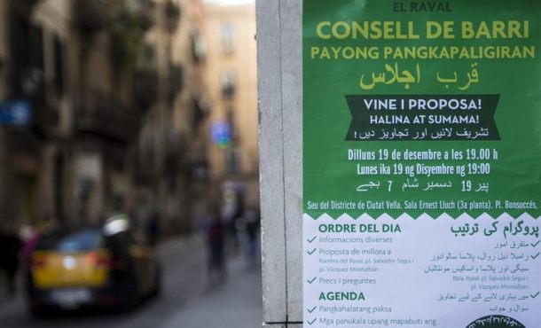 El cartel informa en estos idiomas que el Consejo de Barrio del Raval, donde reside numerosa población inmigrante, se celebra en la sede del distrito de Ciutat Vella a las 19.00 horas y resume el «Orden del día» que se tratará en la reunión.