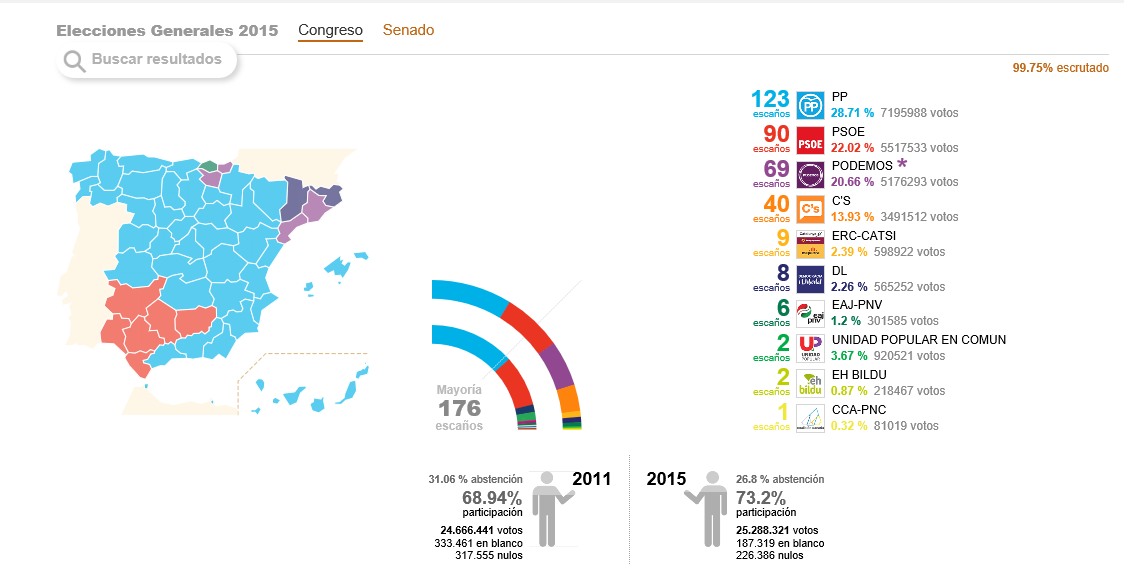 Lasvocesdelpueblo y Rtve – Resultados de las elecciones generales 2015 con el 99,75% del escrutinio. El PP suman 123 escaños, dejándose 63 respecto a los 186 de 2011. Solo una improbable alianza con el PSOE le serviría para tener mayoría absoluta. Es la formación más votada en 13 comunidades y 36 provincias. Fotografía: Algunos simpatizantes, junto a la sede del Partido Popular, en la madrileña calle de Génova. Foto Efe.