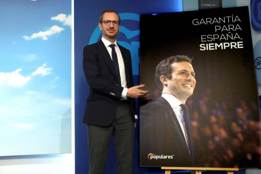 El vicesecretario de Organización del PP y jefe de la campaña electoral, Javier Maroto, ha presentado este lunes, 25 de febrero de 2019, el lema de precampaña del 28 de abril, que es «Garantía para España, siempre» y va acompañado de una fotografía del líder del partido y candidato, Pablo Casado.