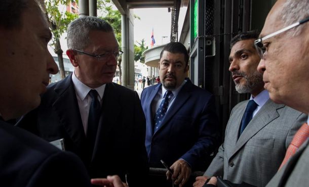 Agencias – El dirigente venezolano de oposición Leopoldo López, preso en una cárcel militar desde 2014, sufrió hoy dos reveses al intentar apelar su sentencia de casi 14 años de cárcel con una audiencia que fue suspendida, y al verse impedido de recibir la visita de apoyo legal español. Las autoridades venezolanas negaron este lunes el permiso al ex ministro español de Justicia Alberto Ruiz Gallardón y el abogado Javier Cremades para visitar a López después de que estos viajaran a Caracas para incorporarse al equipo de defensa del dirigente en esa audiencia de apelación que debía celebrarse hoy. Caracas (Venezuela), lunes 20 de junio de 2016. Fotografía: El abogado español Javier Cremades (d) y el exministro español de Justicia Alberto Ruiz Gallardón (2i) hablan con el abogado defensor del opositor venezolano Leopoldo López, Juan Carlos Gutiérrez (2d), este 20 de junio, en la ciudad de Caracas (Venezuela). Efe.