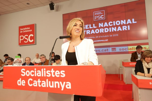 lasvocesdelpueblo y Agencias – ¡Adiós, Pere Navarro! Reproducimos más abajo la lista completa aprobada hoy por el Consejo Nacional del Partido Socialista Obrero Español en Cataluña. La cabeza de lista del Partido socialista Obrero Español en Cataluña (PSC), Carme Chacón Piqueras, a las próximas elecciones Generales de la patria del 20 de diciembre (20D) contará con personas de su máxima confianza, entre las que el ex-número dos del partido, José Zaragoza. Durante su discurso, Chacón ha afirmado que el presidente del Partido Popular, Mariano Rajoy Brey, «es un chollo» para los separatistas excluyentes en Cataluña. Barcelona, 24 de octubre 2015. <Fotografía: la cabeza de lista del PSC al 20D, Carme Chacón durante su discurso hoy en Cataluña>.