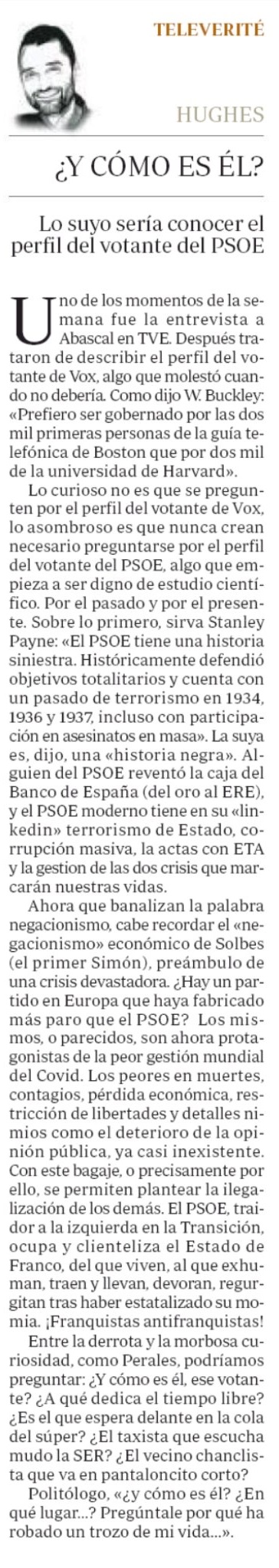 Así explica el columnista y economista de formación, Hughes, en uno de sus columnas en ABC, titulado «¿Y cómo es él?», en referencia al perfil de unos votantes del PSOE, que pese a las atrocidades históricas cometidas por el PSOE y pese a las gestiones criminales de las dos principales crisis: económica de 2008 y sanitaria del covid 19 de 2020, cuya consecuencias graves han robado a cada uno de los compatriotas un trozo de su vida, con el ministro Pedro Solbes y Fernando Simón Soria del Ministerio de Sanidad (director del Centro de Coordinación de Alertas y Emergencias Sanitarias), respectivamente, como nuevo protagonistas. Nota: Agrandar la imagen del artículo en el siguiente enlace (aquí).