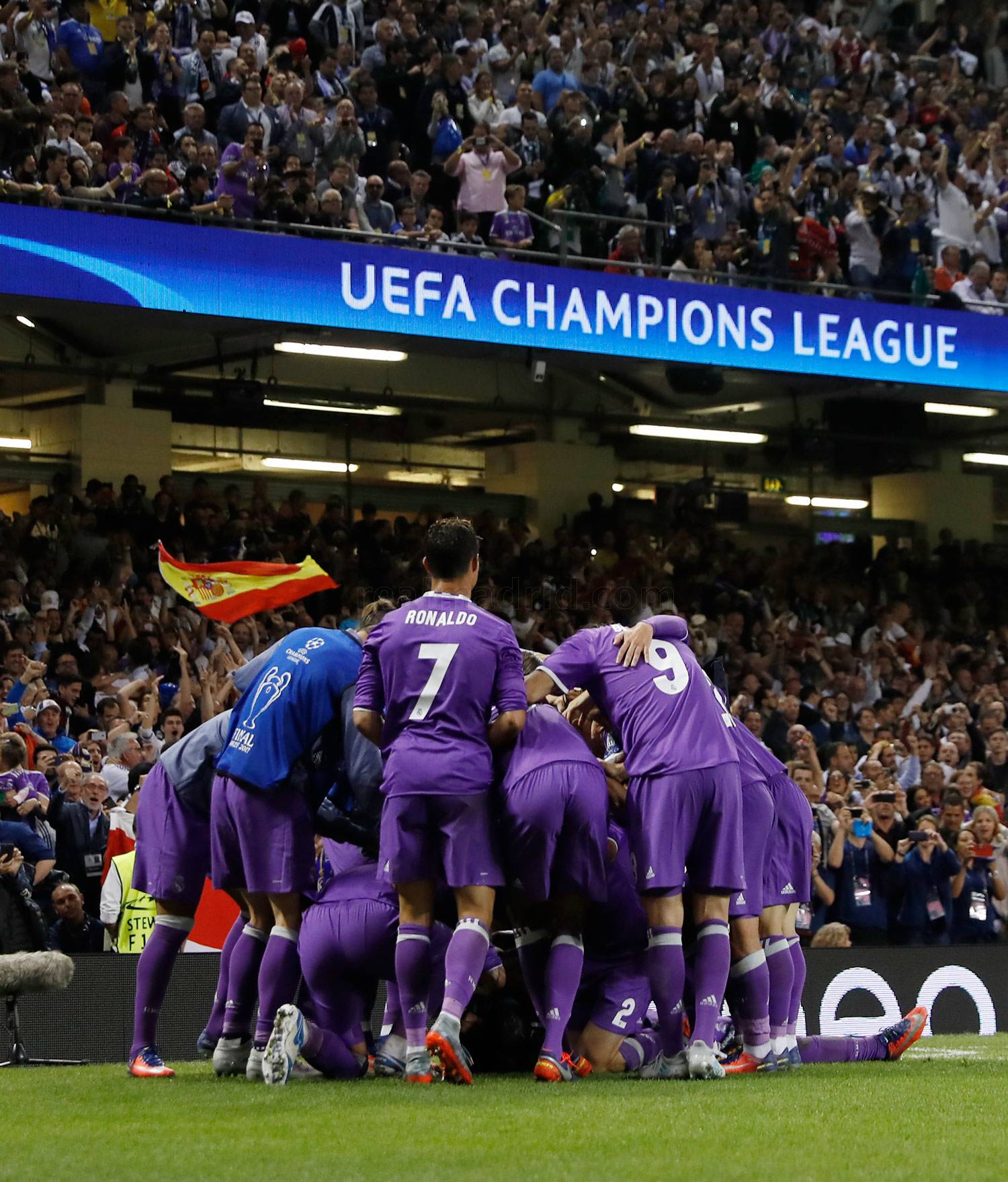 Redacción – El mejor equipo de Europa de anoche en Cardiff (Gales), con un contundente (1-4) ante el equipo italiano Juventus de Turín, y mejor equipo europeo de los último 4 años, tras ofrecer el título de la Liga española hace dos semanas, visitará la Comunidad de Madrid (el gobierno de la capital de España de Cristina Cifuentes (PP), el Ayuntamiento de Madrid de la alcaldesa Manuela Carmena (Podemos) y concluirá ante la ‘Diosa Cibeles’ de los ‘Merengués’ en Plaza Cibeles de Madrid antes de la fiesta en su estadio, Santiago Bernabéu, (desde las 12:00 horas de este media de domingo 4 de junio de 2017, hasta (… según decidan los seguidores ‘blancos’, según el club, pasado las 22:00 [hasta la madrugada del lunes 5 de junio] horas de la noche). Madrid (España), domingo 4 de junio de 2017. Fotografía: El capitán del Real Madrid Sergio Ramos levanta la 12ª en Cardiff junto a sus compañeros después d ela contundente victoria del Real Madrid en final Liga de Campeones 2017. Lasvocesdelpueblo.