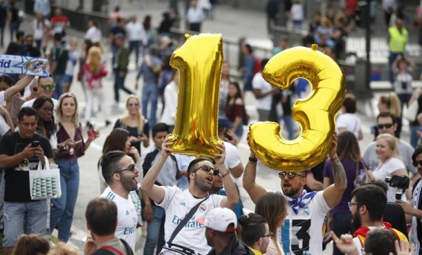 Efe – El autobús del Real Madrid, campeón de la Liga de Campeones, con sus jugadores, cuerpo técnico y con el presidente Florentino Pérez al frente, salió del estadio Santiago Bernabéu para iniciar la ruta recibimientos y homenajes que comenzará en la Catedral de la Almudena y finalizará en el campo madridista con una fiesta ante sus aficionados. Madrid (España), domingo 27 de mayo de 2018. Fotografía: MADRID (ESPAÑA), 27.05.2018. Los aficionados del Real Madrid se han congregado en la plaza de Cibeles de Madrid, para recibir a la plantilla de jugadores que ha conseguido la decimotercera Liga de Campeones tras ganar la final en Kiev por 3 goles a 1 al equipo inglés, Liverpool, el día de ayer. Efe