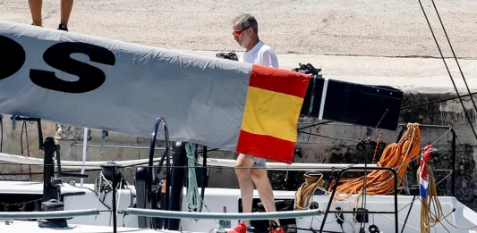 Vestido con equipación deportiva y unas zapatillas rojas y con la mochila a la espalda, el monarca se ha dirigido primero a uno de los edificios del embarcadero, donde ha charlado con algunos de los miembros de la tripulación durante una media hora.