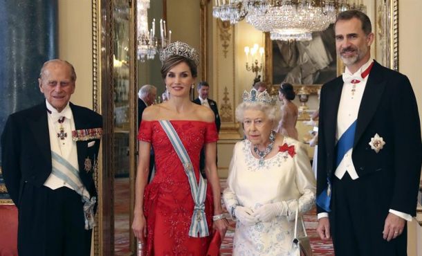 Efe – Recalcó el monarca, antes de añadir: «Y no cabe duda de que los españoles estaremos siempre junto a nuestros amigos y aliados británicos, hombro con hombro, en la lucha contra el terrorismo». Londres (Reino Unido), miércoles 12 de julio de 2017. Fotografía: La Reina Isabel II (2d), el Rey Felipe VI (d), el Duque de Edimburgo (i) y la Reina Letizia (2i) asisten a una cena oficial hoy, miércoles 12 de julio de 2017, en Londres (Reino Unido). Los Reyes de España realizan una visita de estado de tres días al Reino Unido. Efe.