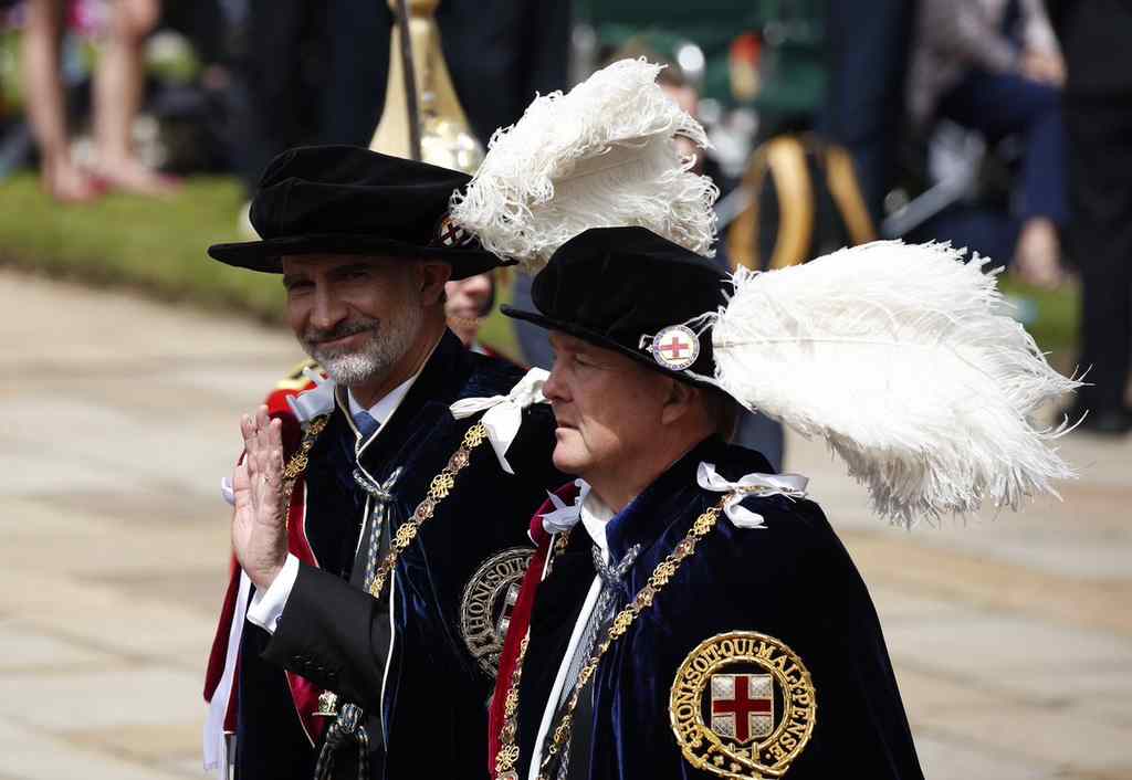 Como establece la tradición, Felipe VI lució la toga de terciopelo azul y el sombrero negro de estilo Tudor con plumas blancas de avestruz que distingue a los miembros de la congregación con los demás atributos, entre ellos, el collar y el escudo de San Jorge, patrón de Inglaterra.