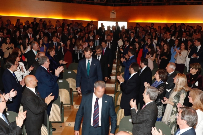 Su Majestad el Rey fue recibido a su llegada al auditorio de Barcelona por el presidente del Tribunal Supremo y del Consejo General del Poder Judicial, Carlos Lesmes; el ministro de Justicia, Rafael Catalá; y el fiscal general del Estado, Julián Sánchez Melgar.