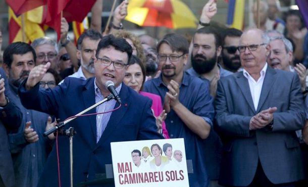 Lasvocesdelpueblo y Agencias – El secretario tercero de la Mesa del Parlamento de Cataluña, Joan Josep Nuet (de Cataluña Si Que Se Puede –Podemos– CSQP), ha alegado ante la juez que le investiga por permitir que el Parlamento de Cataluña debatiera dos resoluciones a favor del referéndum que no es separatista, sino demócrata, y que el reglamento de la cámara le obligaba a facilitar la votación. Barcelona (España), lunes 12 de junio de 2017. Fotografía: El secretario tercero de la Mesa del Parlamento de Cataluña, Joan Josep Nuet, dirige unas palabras a las personas concentradas ante el Tribunal Superior de Justicia de Cataluña (TSJC), tras acudir a declarar hoy como investigado en la causa que instruye el Tribunal Superior de Justicia de Cataluña (TSJC) por permitir que la cámara catalana votara dos resoluciones a favor de un referéndum separatista, declaración en la que ha alegado que no es separatista, sino demócrata, y que el reglamento de la cámara le obligaba a permitir la votación. Efe.