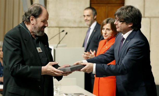 Lasvocesdelpueblo y Agencias – «En la Cataluña que queremos, habrá una representación de todos los ingredientes que están hoy aquí presentes en cada uno de vuestros ejemplos», ha finalizado el presidente antiespañol d ela comunidad autónoma de Cataluña. Barcelona (España), jueves 4 de mayo de 2017. Fotografía: El presidente de la Generalidad de Cataluña, Carles Puigdemont (d), entrega la Cruz de San Jorge al actor y director Josep Maria Pou (i), en presencia de la presidenta del Parlamento, Carme Forcadell (c), durante el acto celebrado esta tarde en el salón San Jorge del Palacio del gobierno autonómico de la Generalidad de Cataluña, en el que se han entregado estos galardones a 29 personalidades y 24 entidades. Efe.