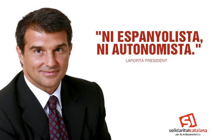 El separatista Joan Laporta Estruch que fue el 38º presidente del FC Barcelona desde el mes de junio de 2003 hasta el 1 de julio de 2010, encabezó de lista del partido excluyente ‘Solidaridad Catalana Por la Independencia’, en noviembre de 2010 y fue elegido diputado autonómico en el Parlamento de regional de Cataluña.