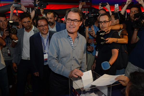 El socio de FC Barcelona, presidente separatista autonómico de Cataluña y candidato número 4 de la Candidatura con el objetivo común de cara al 27-S 2015, Artur Mas Gavarró, ha votado a la presidencia del FC Barcelona este mediodía entre gritos anti catalanes no separatistas de «¡independencia, independencia, independencia!» de Cataluña y «¡presidente, presidente!».