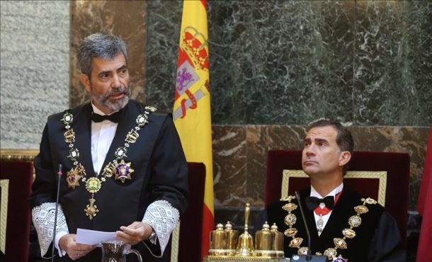 Agencias – El presidente del Tribunal Supremo y del Consejo General del Poder Judicial (CGPJ), Carlos Lesmes, ha afirmado hoy que al margen de la ley «no hay libertad, no hay democracia», sino que solo quedan «espejismos y, en definitiva, frustración»< 8 de septiembre 2015. <Fotografía: El rey Felipe escucha la intervención del presidente del Tribunal Supremo y del Consejo General del Poder Judicial, Carlos Lesmes (i), durante la ceremonia de apertura del Año Judicial que se ha celebrado hoy en la sede del Tribunal Supremo bajo la presidencia del Monarca. Foto/Efe>.
