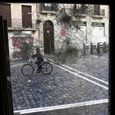 Efe – «Es evidente el grave riesgo que la quema intencionada de contenedores supuso para la integridad física de las personas, teniendo en cuenta que sus autores no se limitaron a prender fuego a los contenedores, sino que además los volcaron y empujaron haciéndolos rodar contra los funcionarios de policía, sin olvidar la multitud de personas, ajenas a la manifestación, que se encontraban en la calle, incluso acompañados de niños, y cuya integridad física también se vio comprometida», argumenta la juez. Madrid (España), jueves 27 de abril de 2017. Fotografía: Estado en el que quedó el cristal de un establecimiento del Casco Viejo de Pamplona tras los incidentes registrados el pasado 11 de marzo. Archivo Efe.