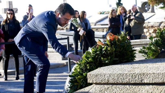 Barcelona (España), lunes 25 de diciembre de 2023 (Lasvocesdelpueblo y Agencias).- El ultra Pere Aragonés García ha homenajeado hoy al golpista Francesc Macià Llussà, visiblemente muy preocupado por la defensa firme del Estado de Derecho y de la democracia española que manifestó por sorpresa su majestad el rey Felipe VI de España, de nombre completo Felipe Juan Pablo Alfonso de Todos los Santos de Borbón y Grecia, durante su mensaje navideño 2023, desde el Palacio Real de la capital del Reino de España, Madrid.