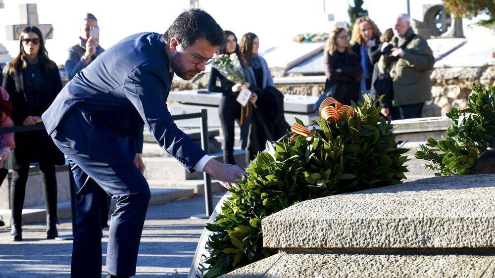 VÍDEO. BARCELONA (ESPAÑA), 25 DE DICIEMBRE DE 2023. PREOCUPANTE DECLARACIÓN EN DIALECTO CATALÁN DEL ULTRA PRESIDENTE DEL GOBIERNO DE LA GENERALIDAD DE CATALUÑA Y DIRIGENTE DE LA IZQUIERDA EXTREMA ESQUERRA REPUBLICANA DE CATALUNYA (ERC), EL APRENDIZ DICTADOR PERE ARAGONÈS GARCÍA, E IMÁGENES DE LA OFRENDA FLORAL EN EL CEMENTERIO DE MONTJUÏC AL GOLPISTA TAMBIÉN MIEMBRO DE ERC, FRANCESC MARCIÀ LLUSSÀ.