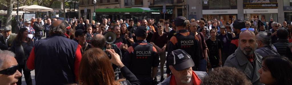 Redacción.- Manresa (Barcelona), sábado 1 de abril de 2023. Un grupo de radicales se han concentrado esta mañana para tratar de boicotear una mesa informativa que VOX había colocado en plaza Crist Rei de Manresa a la que había acudido el diputado y portavoz de VOX en el Parlamento de Cataluña, Joan Garriga Doménech.