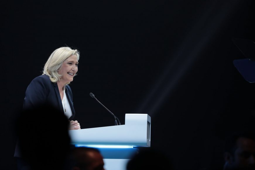 Lasvocesdelpueblo y Agencias.- París (Francia), domingo 10 de abril de 2022. La candidata de Agrupación Nacional, socia de VOX, Marion Anne Perrine Le Pen (Marine Le Pen), que este domingo se clasificó para la segunda vuelta de las presidenciales francesas frente al globalista y progre actual presidente, Emmanuel Jean-Michel Frédéric Macron (Emmanuel Macron), ha pedido el voto a todos aquellos que no le han apoyado a este en la primera durante su discurso histórico esta noche electoral en la que la candidata del pueblo francés está más cerca que nunca de la Presidencia de Francia por el totalitarismo globalista y progre de Macrón durante los últimos cinco años y, también, en una noche electoral que el Partido Socialista Obrero de Francia ha desaparecido a costa de la ultraizquierda y el Partido Popular reducido en casi nada por su ambigüedad durante el mandato de Macron.