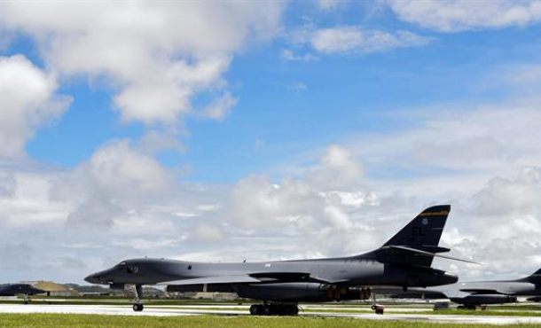 Efe – El régimen de Pyongyang detalló la víspera que prepara un plan para disparar a mediados de agosto cuatro misiles de medio alcance cerca de las aguas territoriales del Guam. «No mires el destello o la bola de fuego, puede dejarte ciego», «guarécete detrás de cualquier cosa que te pueda proteger», «busca un refugio lo más rápido que puedas, aunque estés lejos de la zona cero (…) el viento puede arrastrar la radiactividad», son algunos de los mensajes a tener en cuenta. Bangkok, viernes 11 de agosto de 2017. Fotografía: Bombarderos estratégicos B-1B en la base de la fuerza aérea de Andersen cerca de Yigo, Guam. Efe.