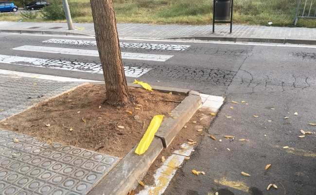 Galería. Barcelona, 06.10.2018. Hoy, sábado 6 de octubre sobre las 8:00 horas de la mañana, una vecina de San Celoni, seguidora de Ñ Pueblo Lasvocesdelpueblo se ha desplazado hasta el lugar del incidente y ha hechos las siguientes fotografías, que muestran restos de lazos amarillos, nombre de la calle etc..