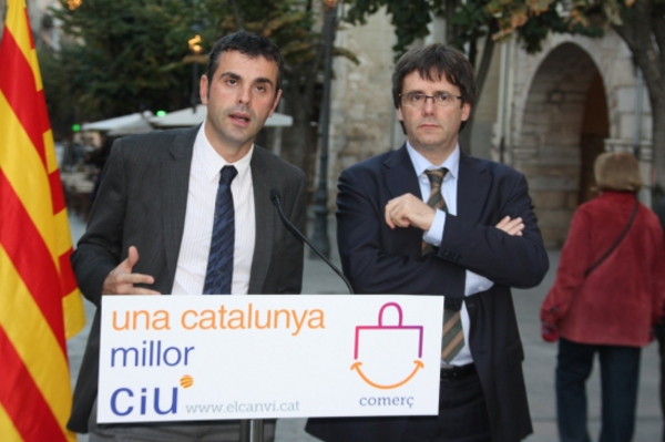 El exconsejero Santi Vila, de cabeza de lista de Convergencia-PDECAT en Gerona junto al entonces número 6 de Convergencia, el fugado delincuente Carles Puigdemont, durante el inicio d ela campaña electoral del 27-S de 2015 en la rambla de Gerona. Archivo ACN
