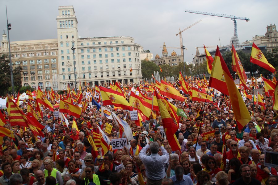 FOTOGRAFÍA. PLAZA DE CATALUÑA DE BARCELONA (CIUDAD CONDAL) ESPAÑA, 12.10.2018. Vista de una plaza emblemática de la Ciudad Condal española, capital de provincia de Cataluña, Barcelona, abarrotada de más de 300 mil personas, otras fuera de la Plaza, durante los parlamentos del Día de la Hispanidad 2018. Lasvocesdelpueblo (Ñ Pueblo)