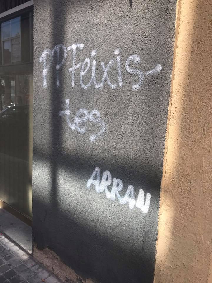 Parra: «Así nos hemos encontrado esta mañana nuestra sede», señaló el concejal del PP Sabadell en un mensaje con tres fotografía del ataque que lleva incluso la firma de la juventud extremista ultraviolenta de CUP, «ARRAN», firman los atacantes.