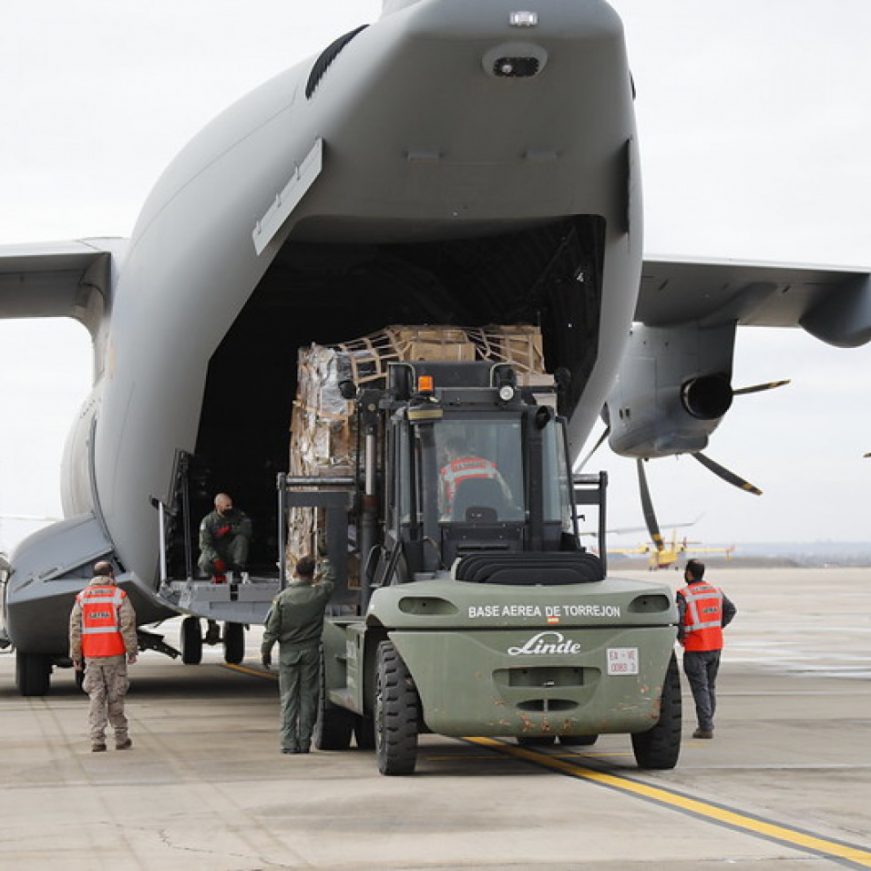 Efe.- Torrejón de Ardoz (Madrid) España, domingo 27 de febrero de 2022. España va a hacer un envío urgente de 20 toneladas de material de defensa y sanitario destinado a Ucrania, tras la invasión de este país por parte de Rusia, en dos aviones del Ejército del aire que tienen previsto volar este domingo desde la base aérea de Torrejón de Ardoz (Madrid) hasta Polonia.