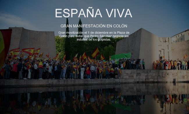Lasvocesdelpueblo y Agencias – La llamada «España Viva» de VOX se ha convertido en una plataforma «nacional» para denunciar el «negocio» que hace el presidente de Gobierno de España, Pedro Sánchez con los golpistas, denuncia ‘España Viva’ en de la convocatoria. La entidad ha convocado hoy una «Gran movilización el 1 de diciembre de 2018 (1-D) en la Plaza de Colón (Madrid) para evitar que Pedro Sánchez negocie los indultos de los golpistas». El presidente de VOX, Santiago Abascal Conde, ha invitado a todos los partidos constitucionalistas, destacando a PP y Ciudadanos, a «acudir a esa gran movilización nacional en contra de la impunidad» convocada a través de la plataforma España Viva el próximo 1 de diciembre en la madrileña plaza de Colón. Madrid (España), lunes 5 de noviembre de 2018. fotografía: BARCELONA (ESPAÑA), 05.11.2018. Captura pantalla d ela portada del sitio web de la Plataforma ‘España Viva’ afines a VOX. La nueva entidad ha convocado hoy su primera manifestación contra la impunidad de los golpistas independentistas líderes del ‘Procés’ y para denunciar las negociaciones entre el presidente de Gobierno Pedro Sánchez y separatistas, el próximo 1 de diciembre de 2018 en Plaza de Colón Madrid. Lasvocesdelpueblo