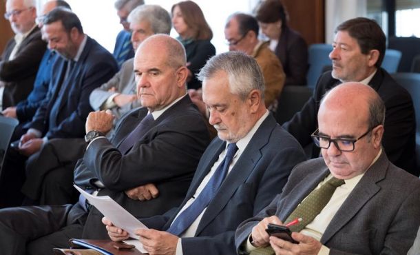 Efe – El expresidente de Andalucía José Antonio Griñán se enfrenta a 6 años de cárcel y 30 de inhabilitación. A diferencia de Manuel Chaves, que solo está acusado de prevaricación y afronta 10 años de inhabilitación pero no pena de prisión, el Ministerio Público y las acusaciones populares (PP y Manos Limpias) atribuyen a Griñán la responsabilidad de no haber atendido los avisos de la Intervención de la Junta alertando de que el sistema que se usaba para dar las ayudas no era «adecuado». Sevilla (España), lunes 9 de abril de 2018. Fotografía: SEVILLA (ESPAÑA), SEMANA DEL 02.04.2018. Los expresidentes de la Junta de Andalucía, Manuel Chaves (i), y José Antonio Griñán (c), junto al exconsejero de Presidencia, Gaspar Zarrías (d), durante la declaración del exconsejero de Empleo Antonio Fernández la semana pasada, en la Audiencia de Sevilla. Efe.