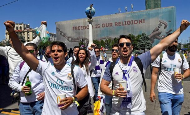 Efe – Cinco jugadores que hicieron historia con el Real Madrid como Raúl González, Roberto Carlos, Pedja Mijatovic, Álvaro Arbeloa y Míchel Salgado, desataron la locura en la ‘fan zone’ de seguidores madridistas en el centro de Kiev, a horas de la final de la Liga de Campeones ante el Liverpool. Kile (Ucrania), sábado 26 de mayo de 2018. Fotografía: KILE (UCRANIA), 26.05.2018. Real Madrid fans gather in Maidan Square, Kiev, Ukraine, 26 May 2018. Real Madrid will face Liverpool FC in the UEFA Champions League final at the NSC Olimpiyskiy stadium. Efe