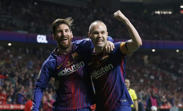 Lasvocesdelpueblo y Agencias – El Barcelona alcanza su trigésimo título de Copa y por primera vez lo hace en cuatro ocasiones seguidas. El equipo catalán se quedará el título en propiedad. Madrid (España), sábado 21 de abril de 2018. Fotografía: MADRID (ESPAÑA), 21.04.2018. Los jugadores del FC Barcelona, el delantero argentino Lionel Messi (i) y el centrocampista Andrés Iniesta, celebran tras el cuarto gol del partido convertido por Andrés Iniesta, durante la final de la Copa del Rey en el estadio Wanda Metropolitano de Madrid. Efe.