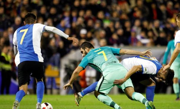 Agencias – El FC Barcelona, vigente campeón de la Copa de su Majestad el Rey Felipe VI, sólo pudo arrancar un empate (1-1) en Alicante ante el Hércules, equipo de Segunda B, en el encuentro de ida de los dieciseisavos de final de la Copa del Rey de este miércoles 30 de noviembre de 2016. Alicante (España), jueves 1 de diciembre de 2016. Fotografía: El centrocampista turco del FC Barcelona, Arda Turan (c), lucha el balón con Pedro Inglés (d), del Hércules, durante el encuentro correspondiente a la ida de los dieciseisavos de final de la Copa del Rey que se disputa esta noche en el estadio José Rico Pérez, en Alicante. Efe.